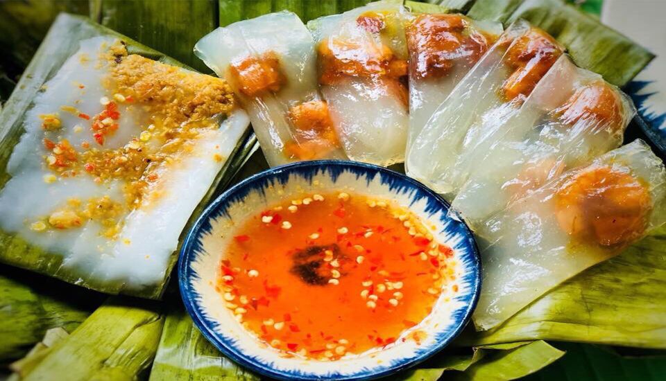 Ces petites bouchées vapeur, fines et légères, sont emblématiques de la cuisine raffinée de Hué. Le bánh bèo est servi dans une coupelle avec crevettes et croûtons. Le bánh nậm, plat et fondant, et le bánh lọc, translucide avec une crevette entière, s’accompagnent d’une sauce à l’ail et au piment.