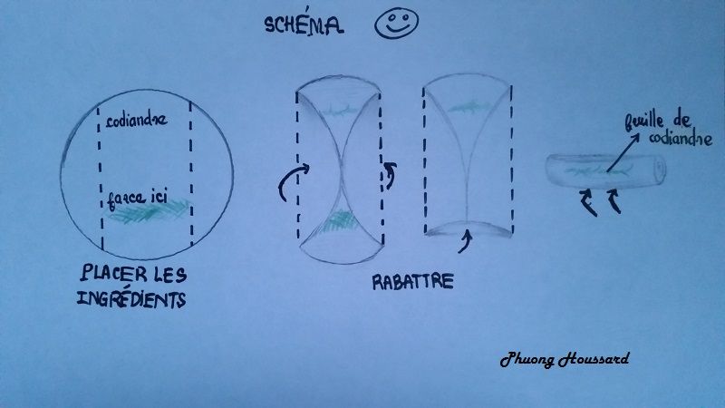 * Dans le bas de la galette, déposez dans l'ordre la feuille de salade, les vermicelles de riz cuits, un peu de carottes râpées, la viande, les pousses de soja, les herbes ( si vous en avez pas trouvé de feuille de basilic, ne remplacez pas par le basilic car son goût très fort pourrait gâcher celui des autres herbes). A la place de codiandre ( dans mon schéma) , on place soigneusement les 2 moitié d'une crevette. Elles donnent une jolie apparence à la finition.