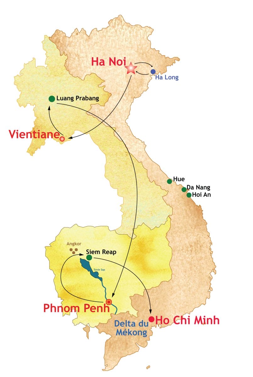 Voyage en Indochine 15 jours ou Trésors d'Indochine 15 jours présente cette odyssée de rêve, totalement hors du temps, qui vous emmène sur les routes du Vietnam, du Laos et du Cambodge pour une découverte tout en douceur de la mythique Indochine. Un long voyage d'exception qui fait la part belle aux rencontres et aux sites remarquables, le plus souvent classés UNESCO.